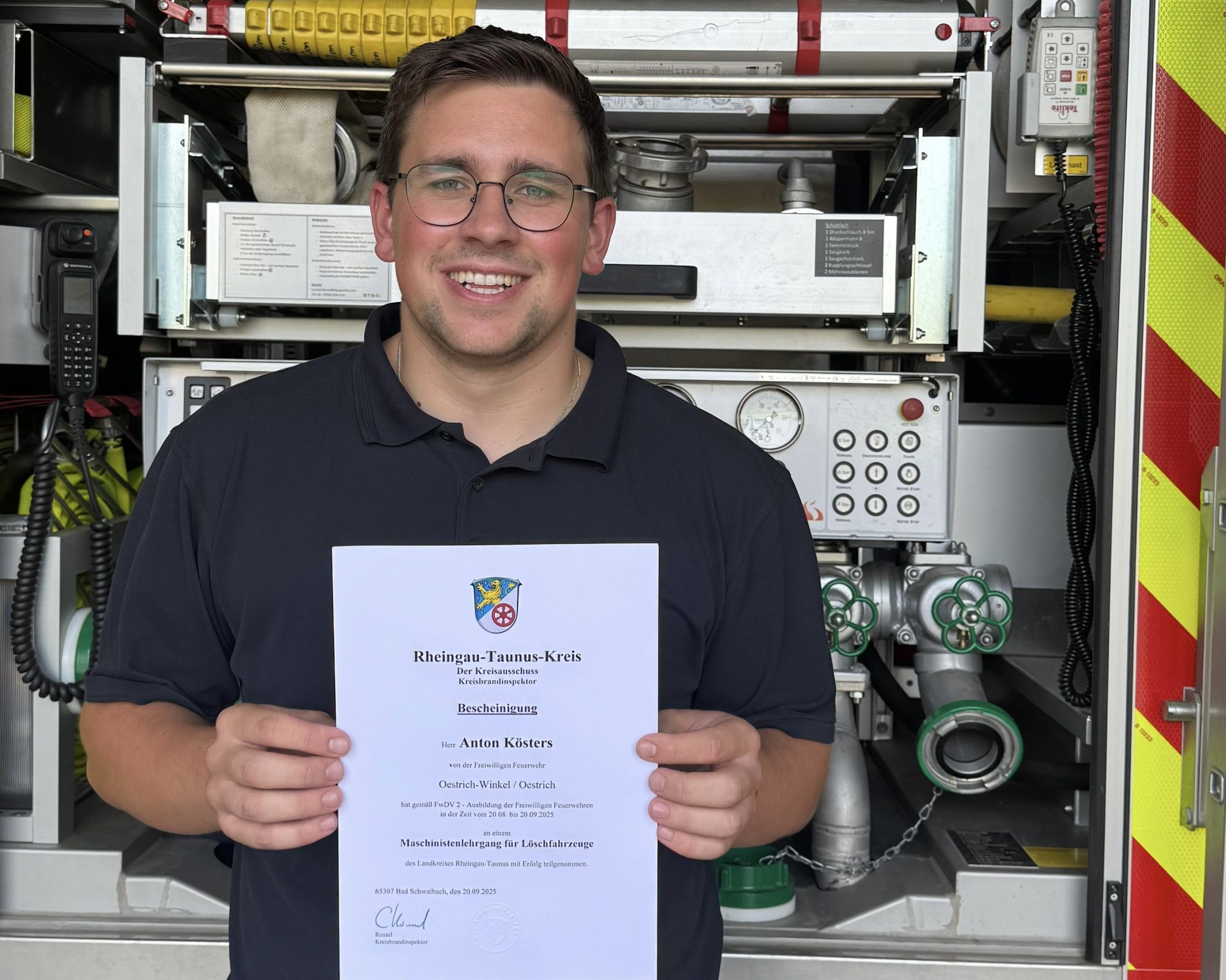 Bestandener Lehrgang Wir gratulieren unserem Kameraden Anton Kösters ganz herzlich zum bestandenen Lehrgang “Maschinist für Löschfahrzeuge“. Ab sofort darf er als Fahrer